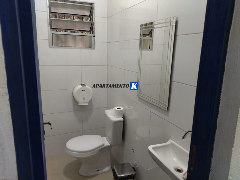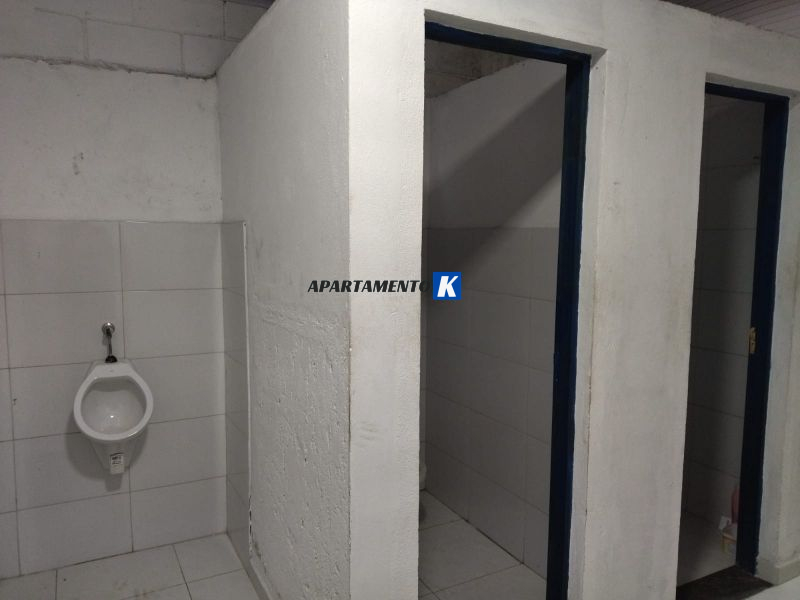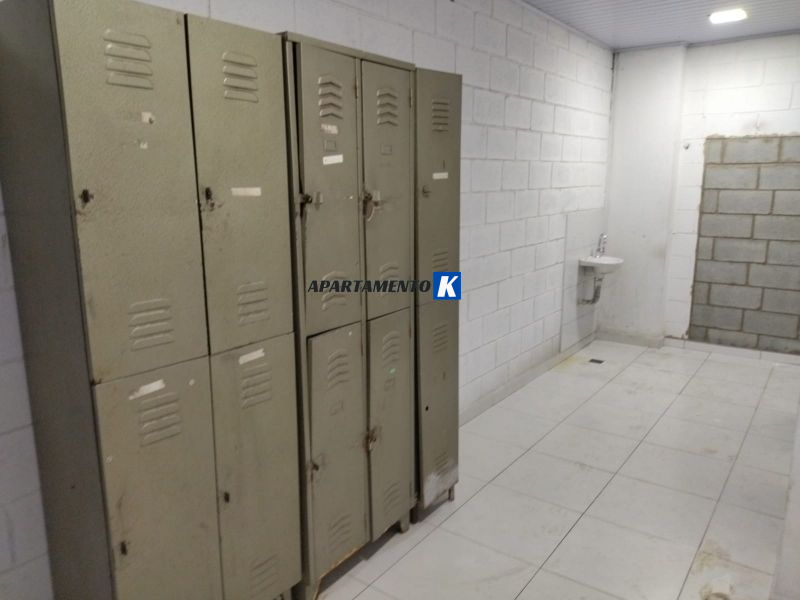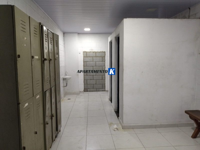 Salão tem vestiário com banheiros e corredor externo para depósito.