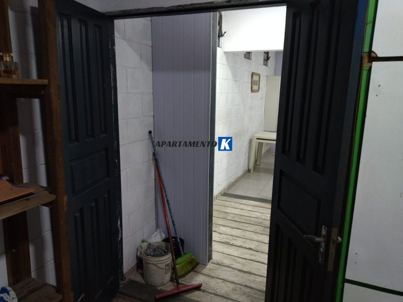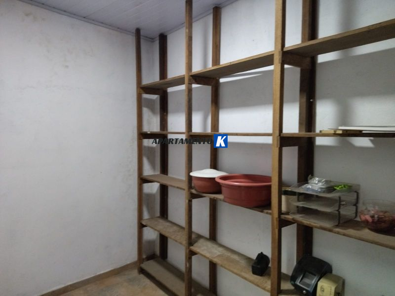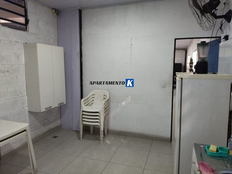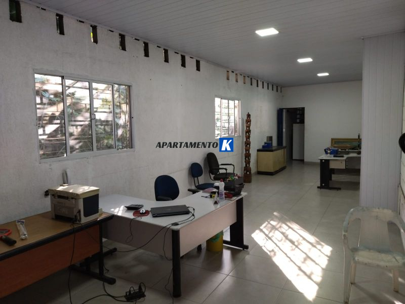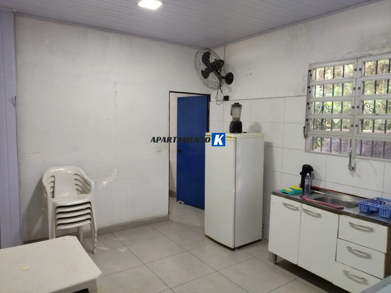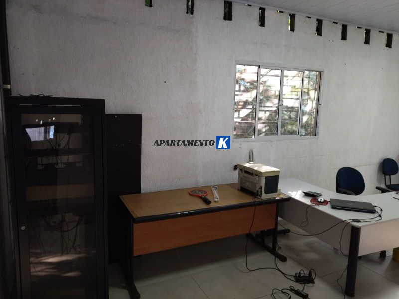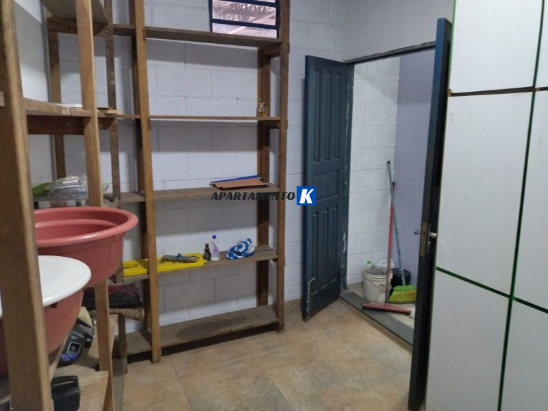 Mezanino com sala, cozinha, banheiros e depósito.